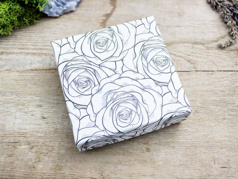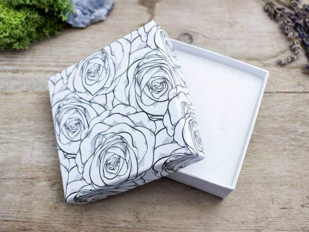 Papírból készült fehér alapon fekete színű rózsa mintával díszített ékszerdoboz. A benne található a szivacs fehér színű.