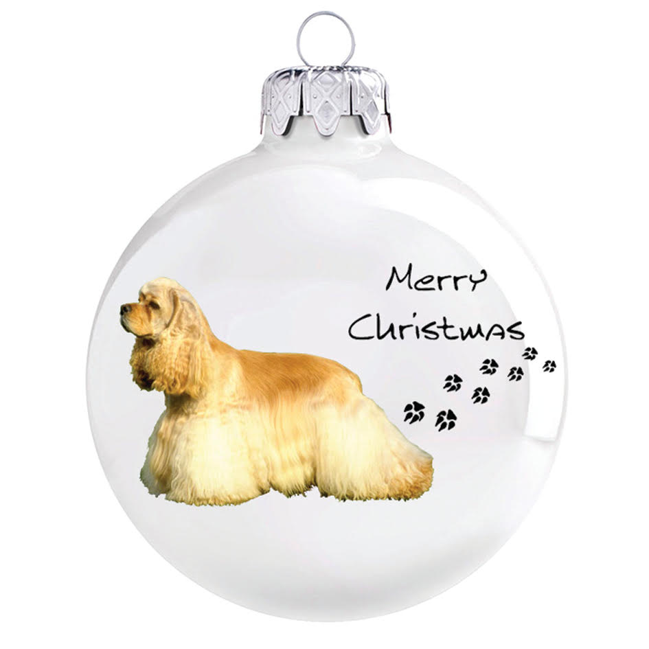 Porcelán hatású üveg fehér dísz "Amerikai cocker spániel" mintával. Üveg karácsonyfadíszeinket nagy gondossággal, kézzel készítjük, így biztosítva a magas minőséget és az egyedülálló mintázatot.