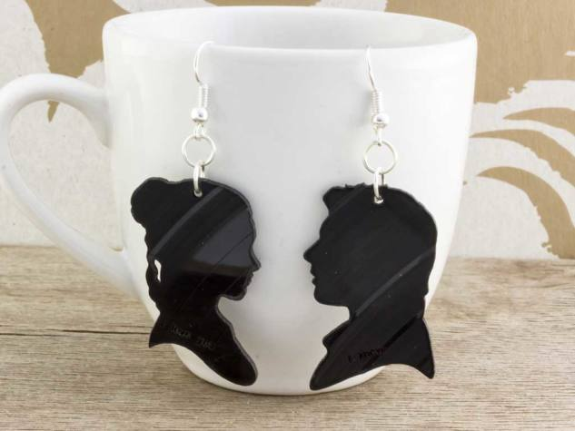 Egyedi tervezéssel készült, géppel alakra vágott, majd megmunkált bakelit lemezből megálmodott fülbevaló.