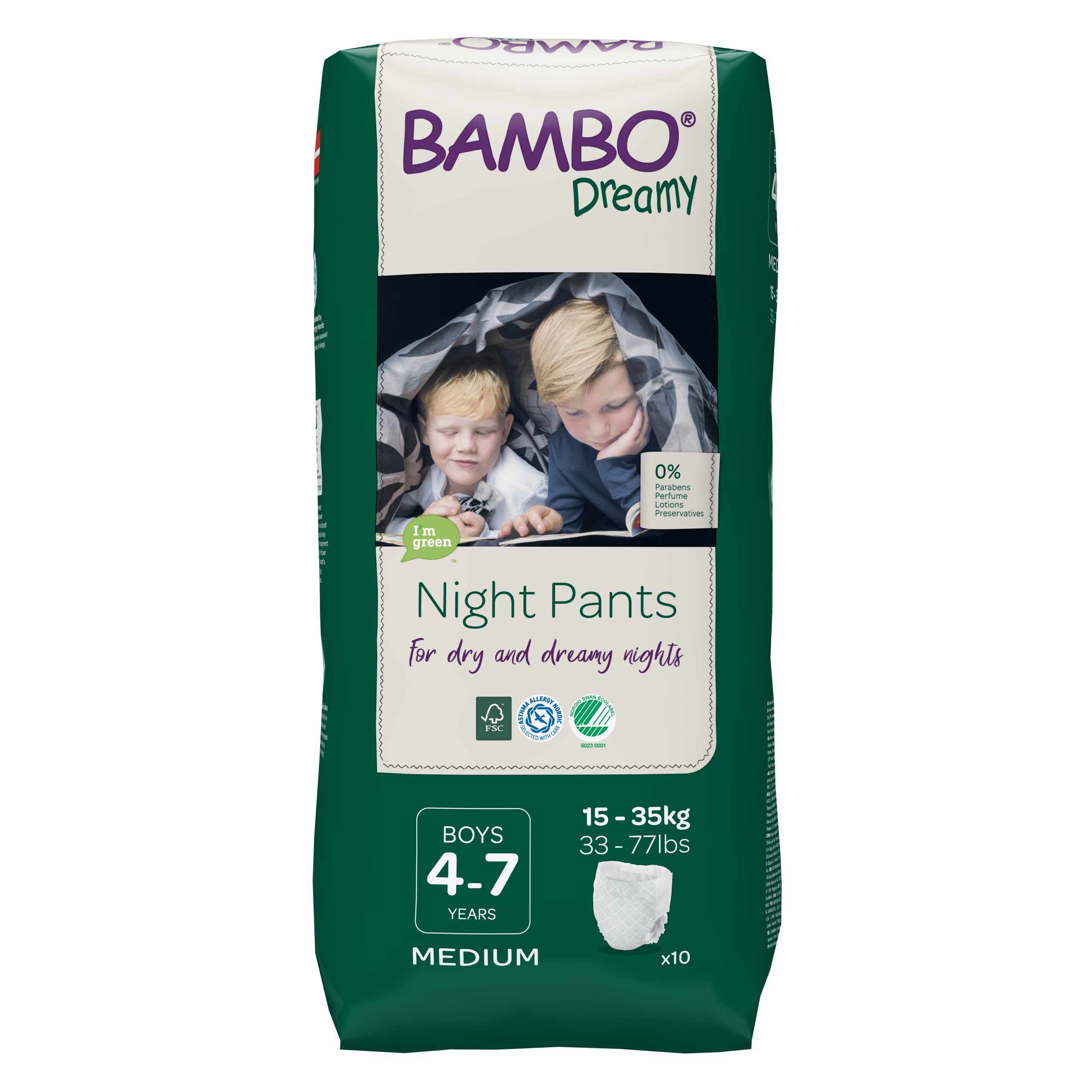 A Bambo Dreamy Éjszakai Pelenkák bőrgyógyászatilag teszteltek, Nordic Swan, Asztma-Allergia társaság és az FSC™ tanúsítványokkal rendelkeznek. Illatanyag- és színezékmentesek, hogy minimalizálják az allergia és a pelenkakiütés kockázatát.