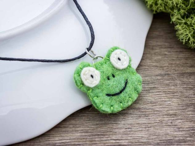 A jópofa békák nyakláncként is megjelentek. Kis zöld béka-fejek fekete – állítható hosszúságú – pamutláncon.
