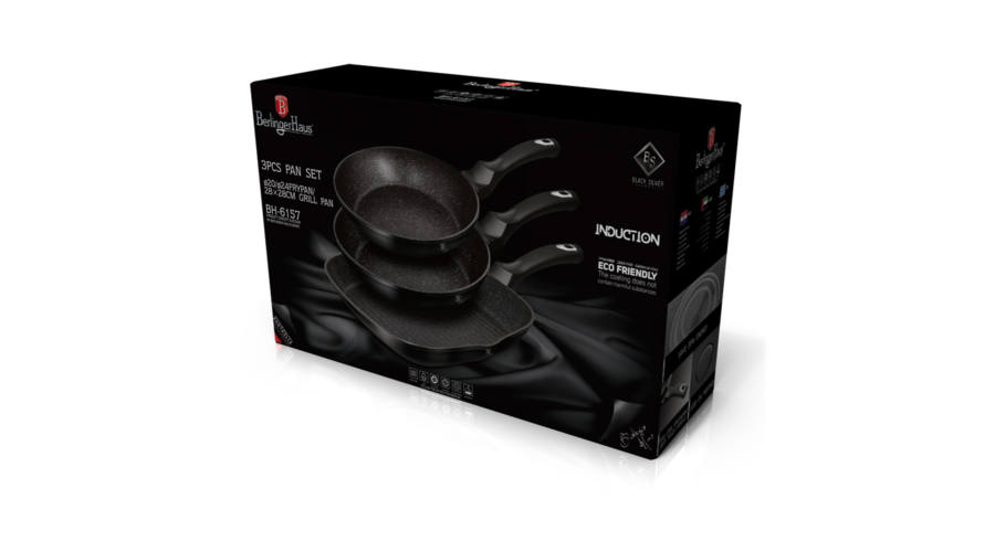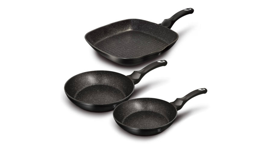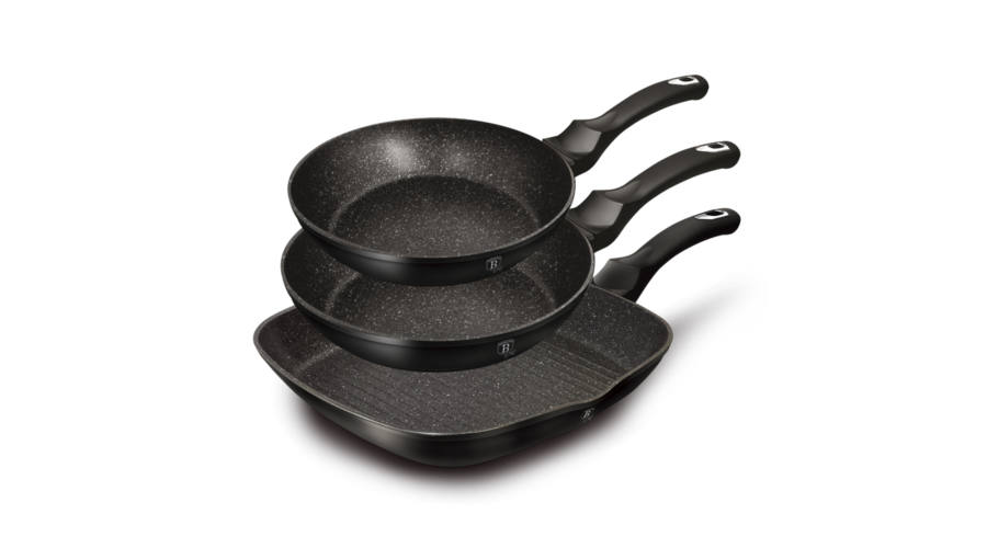 A szett tartalma: Serpenyő Ø20*4.5 cm 1,0L Serpenyő Ø24*4,8 cm 1,7L Grill serpenyő Ø28*4,1 cm 2,1L • 3 rétegű márvány bevonat • ergonomikus puha tapintású nyél