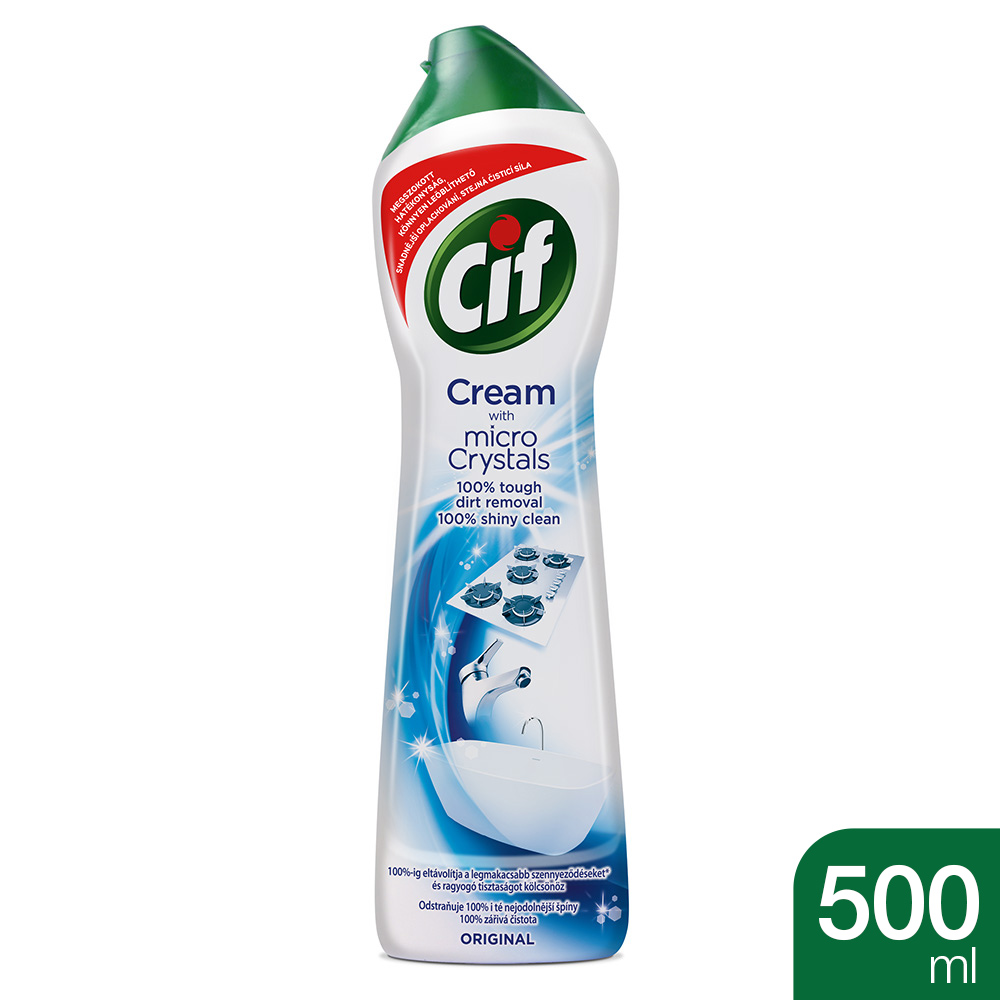 Cif súrolókrém mikrokristályokkal – a valaha volt legjobb Cif súrolókrém. Eltávolítja a makacs szennyeződéseket is a 100% ragyogó tisztaságért. Áthatol a legmakacsabb szennyeződéseken, mint az odaégett zsírfoltok és ételmaradékok, fürdőszobai vízkő lerakódások; új állagának köszönhetően könnyebb leöblíteni, így hamarabb élvezheted a tökéletesen ragyogó tisztaságot. 100%-ig eltávolítja a legmakacsabb szennyeződéseket* és ragyogó tisztaságot kölcsönöz.