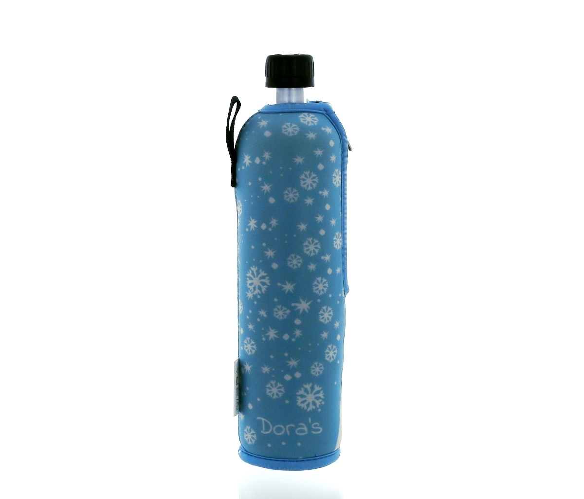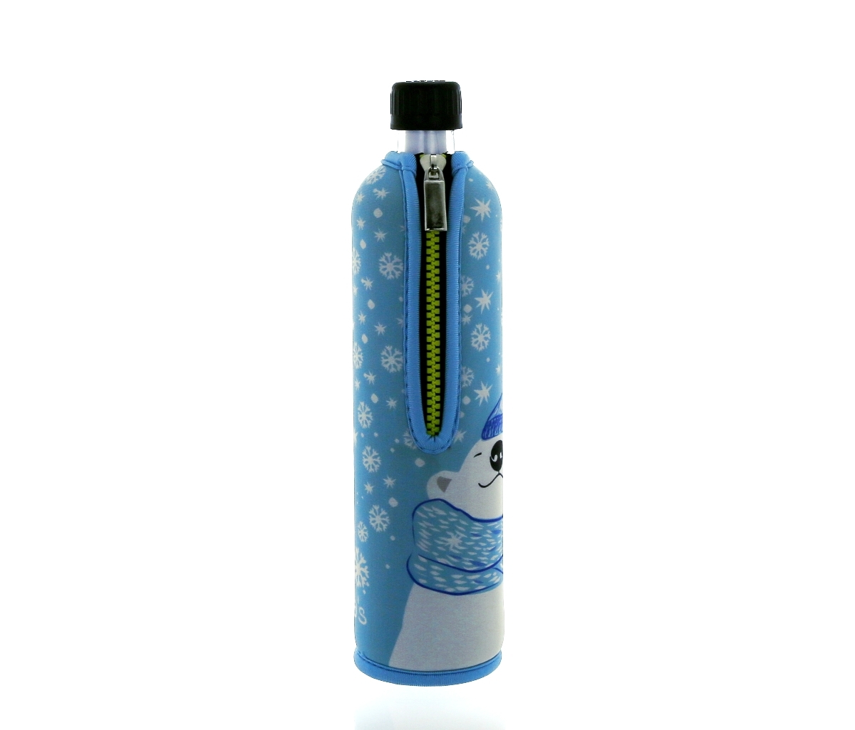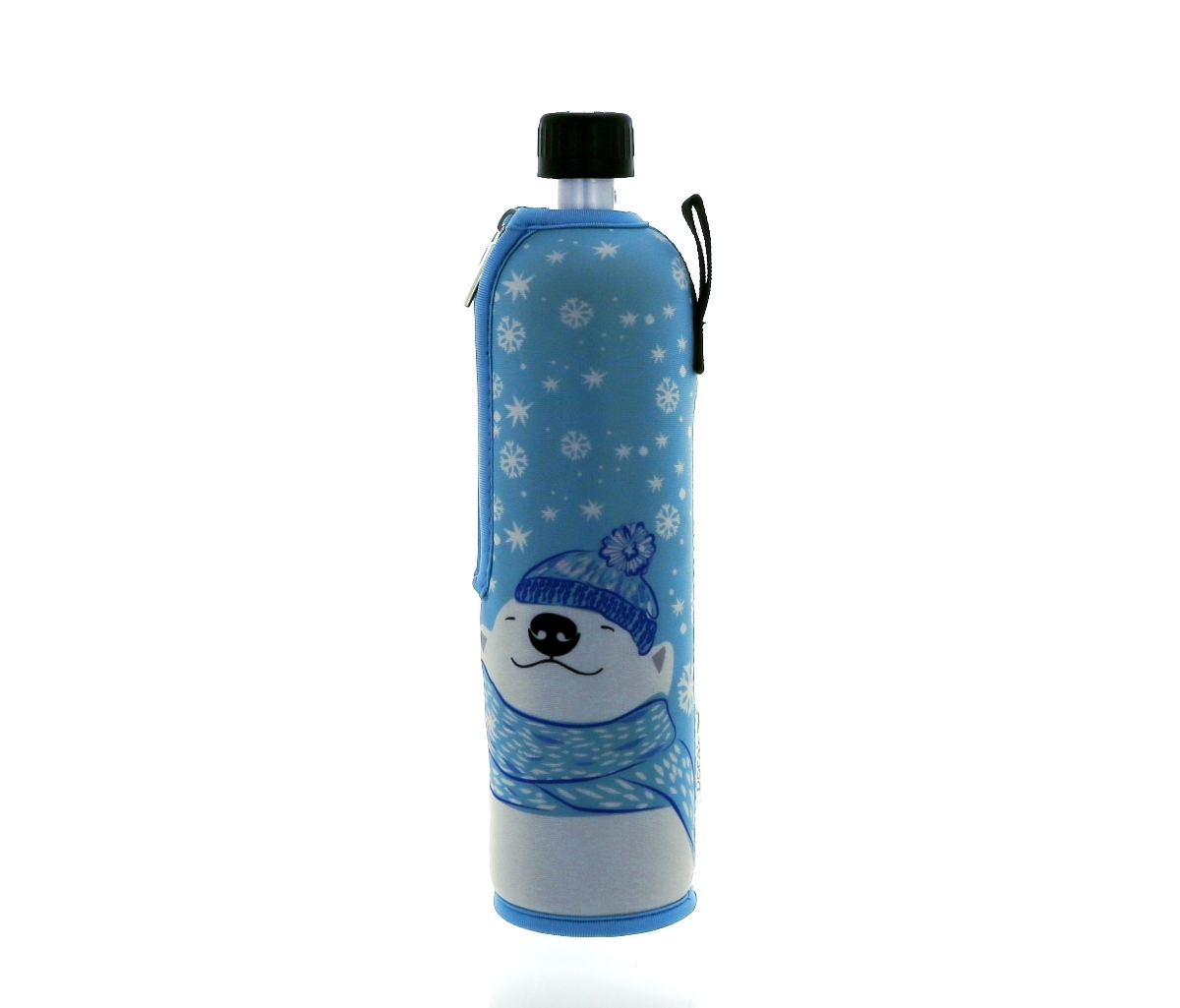 DORAS saját gyártású, átlátszó üvegkulacsa vilégoskék alapon, fehér jegesmede mintás, cipzáros neoprén huzattal.