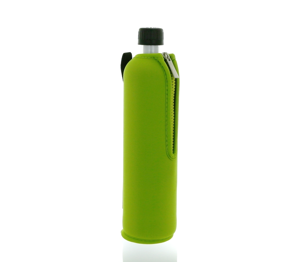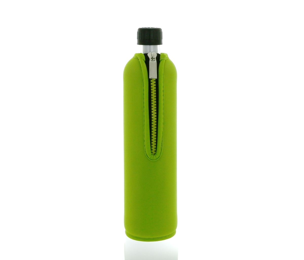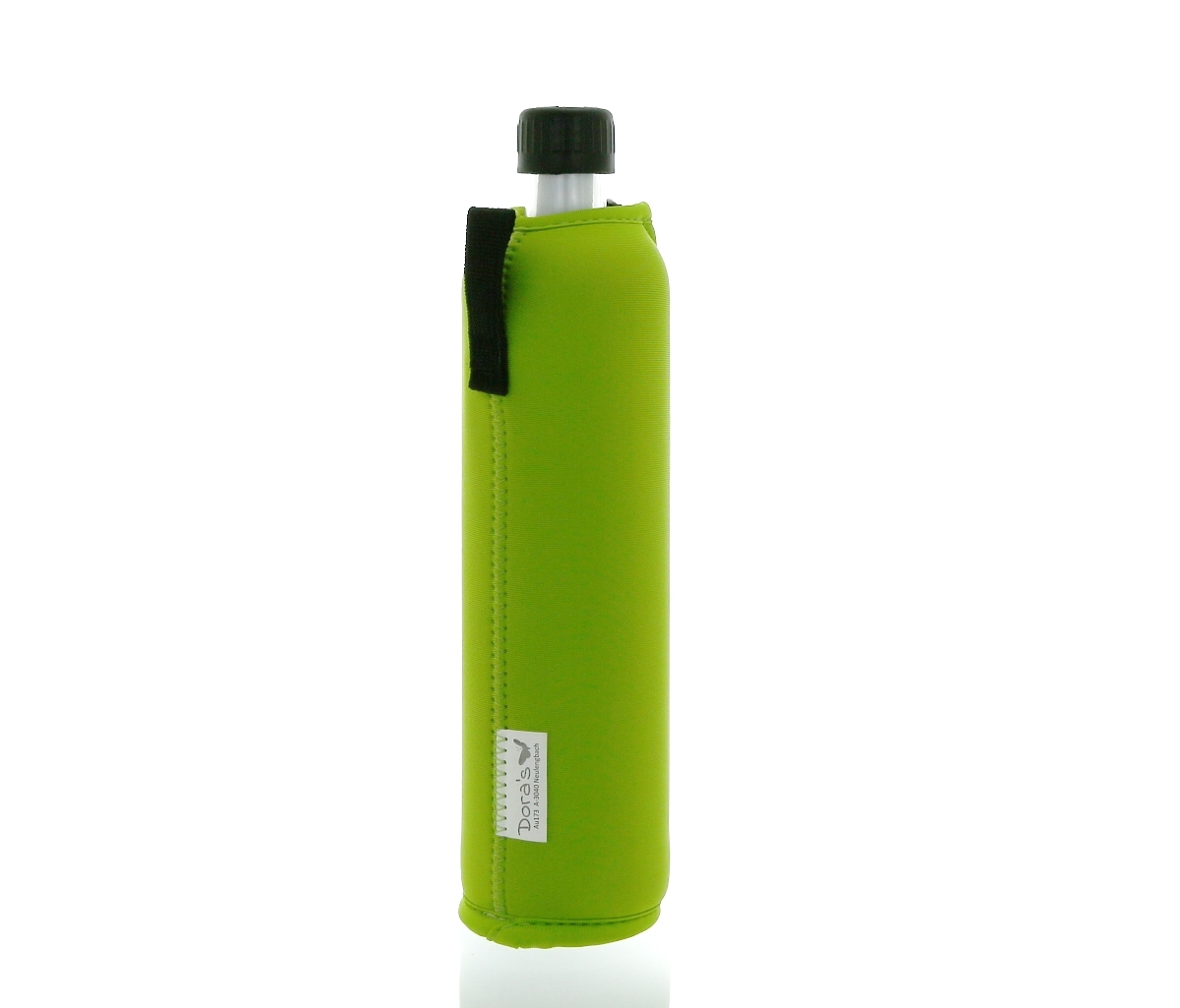 DORAS saját gyártású, átlátszó üvegkulacsa neonzöld színű, cipzáros neoprén huzattal.