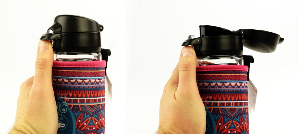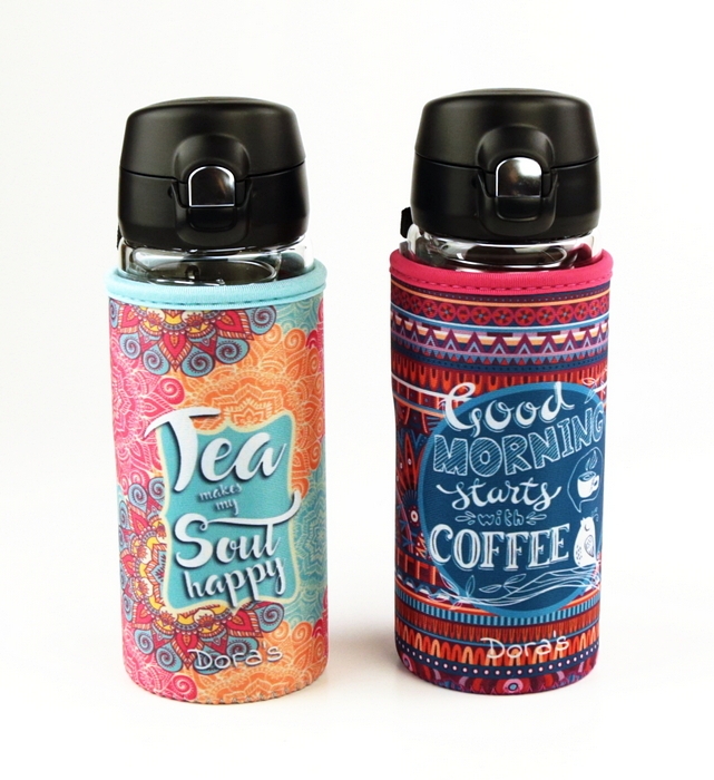 DORAS saját gyártású, átlátszó tea és kávé üvegkulacs kifordítható mintás neoprén huzattal, egykezes gyors zárású kupakkal.