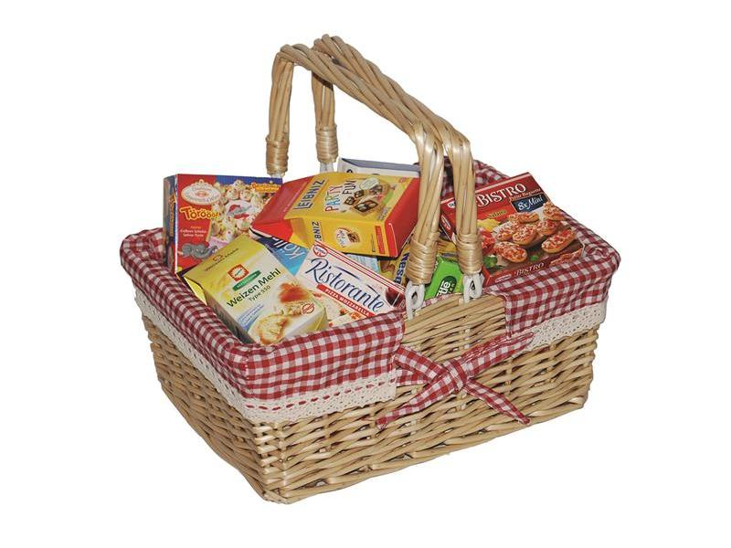 Fonott kosár, piros kockás, kitűnő miniatűr összecsukható dobozokkal.