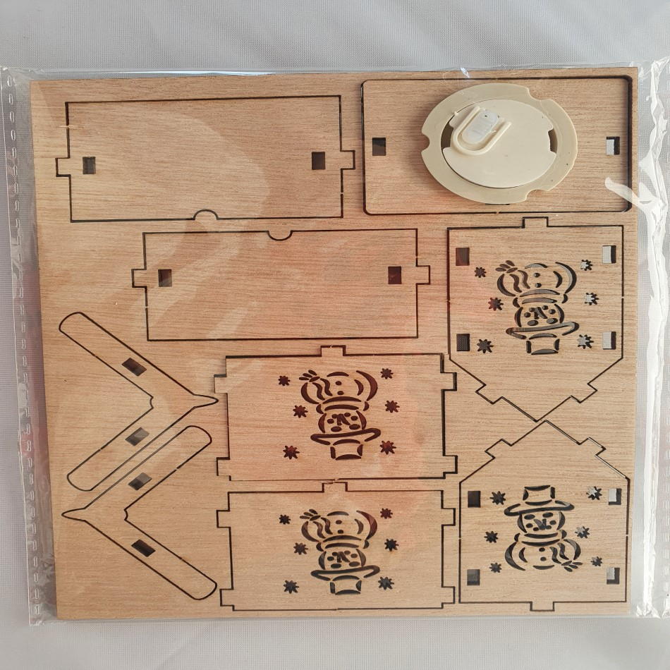 Fa házikó lapra szerelt LED+zsinór5,2*6,5*6,5 cm Hóember.