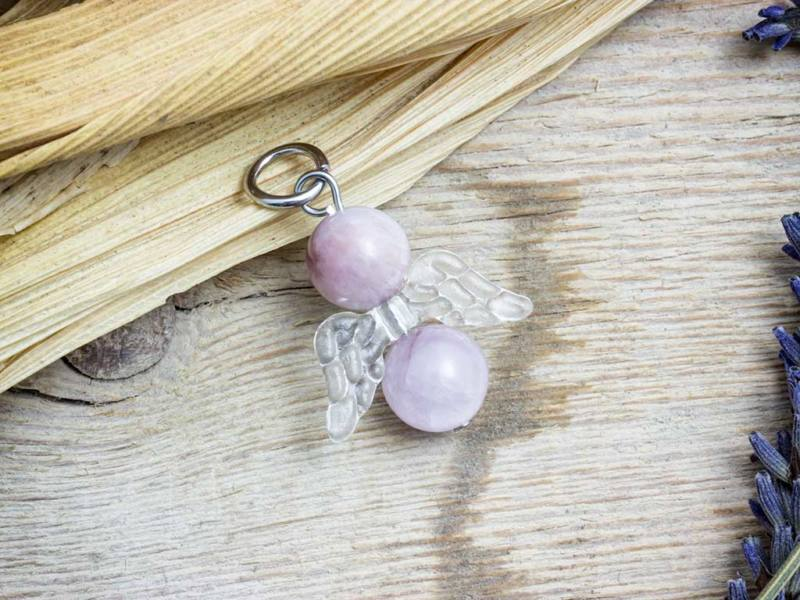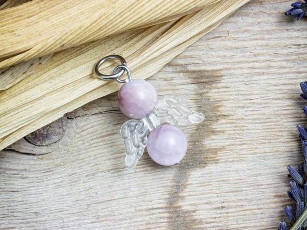 A valódi ásvány medál fém akasztó részét acélból / orvosi fémből készítettük, így tökéletesen antiallergén. Az angyalka szárnya akrillból készült. Az angyalka fejét, és testét valódi 8mm-es kunzit ásvány gyöngyök alkotják.
