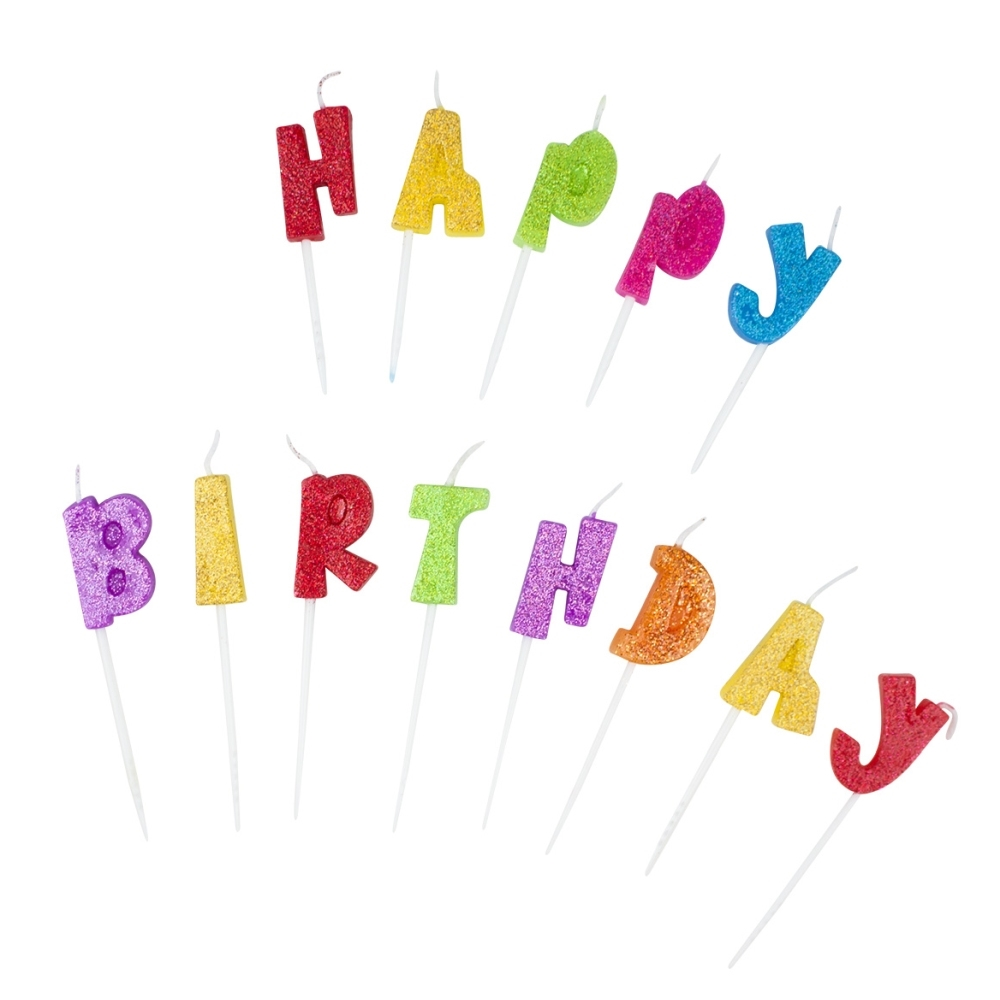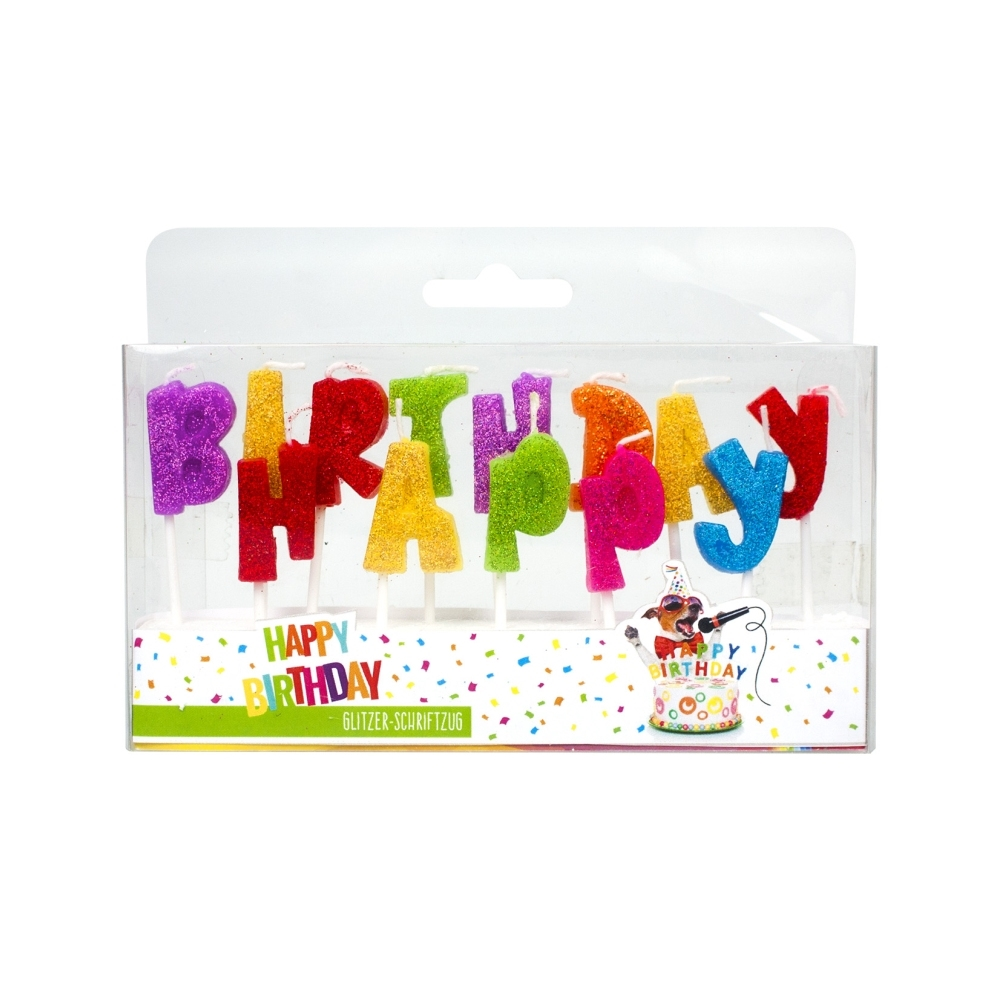 Színes, szülinapi gyertya szett, melynek sorbarakott csillogó betűiből a Happy Birthday felirat olvasható ki. A gyertyák a hozzájuk tartozó gyertyatartókkal könnyen a tortára helyezhetők.