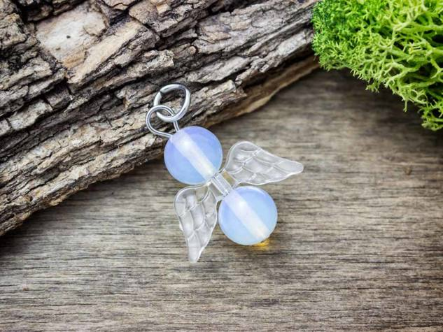 A valódi ásvány medál fém akasztó részét acélból / orvosi fémből készítettük, így tökéletesen antiallergén. Az angyalka szárnya akrillból készült. Az angyalka fejét, és testét valódi 8mm-es opalit ásvány gyöngyök alkotják.