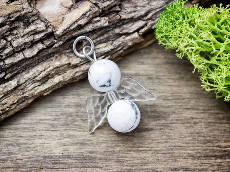 A valódi ásvány medál fém akasztó részét acélból / orvosi fémből készítettük, így tökéletesen antiallergén. Az angyalka szárnya akrillból készült. Az angyalka fejét, és testét valódi 8mm-es howlit ásvány gyöngyök alkotják.