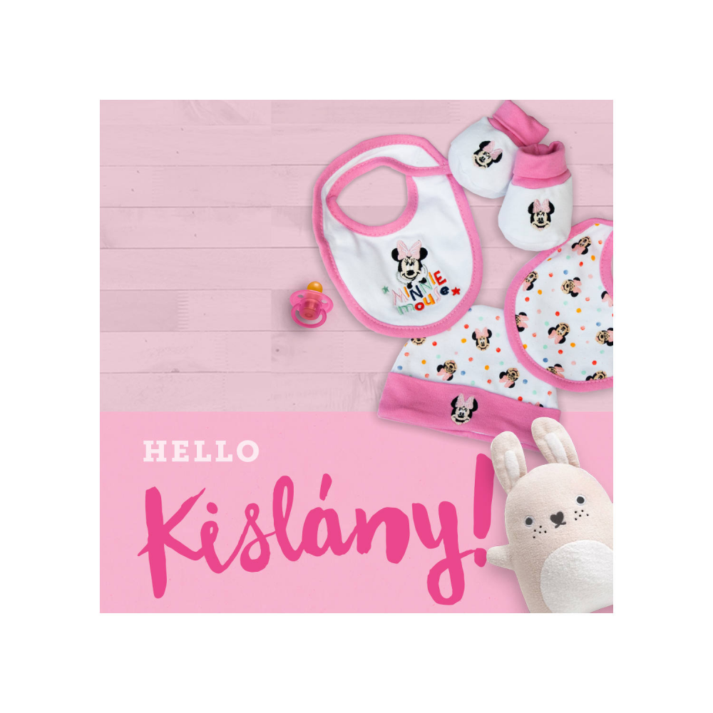 Minnie egér 4 darabos baba ajándék szett 100% pamut alapanyagból. A doboz tartalma: 1 darab baba sapka, 1 pár baba cipő, 2 darab baba előke. A termék díszdobozban kapható, selyemszalaggal átkötve.