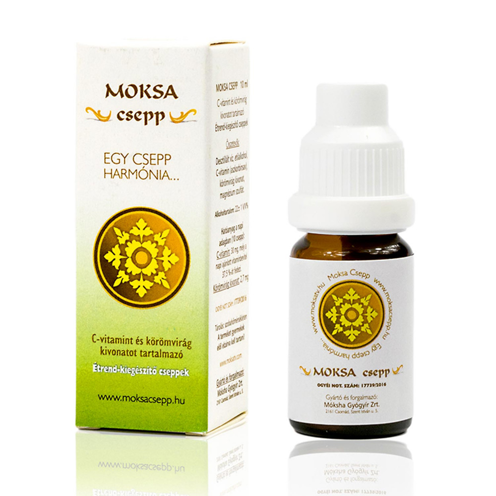 Nettó térfogat: 10 ml | Csomagolás: 10 ml-es cseppentős sötét üveg, műanyag zárókupakkal. Színesnyomású kartondobozba helyezve. | Érzékszervi tulajdonságok: Halványsárga, enyhén alkoholos illatú, vízben jól elegyedő. | Tárolás: szobahőmérsékleten. 10 ml-es cseppentős sötét üveg műanyag zárókupakkal. Szinesnyomású kartondobozba helyezve. A Moksa Csepp étrend-kiegészítő szer, mindemellett az optimális hatás érdekében elengedhetetlen a készítmény körültekintő alkalmazása. Figyelmeztetések: Az ajánlott napi mennyiséget ne lépje túl. Az étrend-kiegészítő nem helyettesíti a kiegyensúlyozott vegyes étrendet és az egészséges életmódot.A terméket gyermekek elől elzárva kell tartani!A készítményt csak a csomagoláson jelzett minőség-megőrzési időn belül szabad felhasználni.