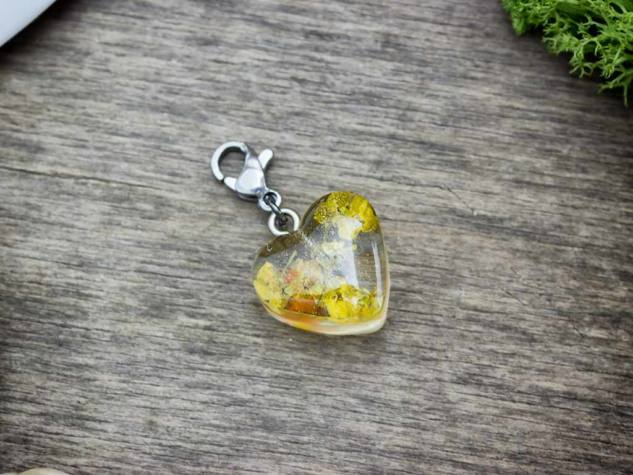 Gyanta mögé rejtett préselt virág kompozíciója ölt testet a medálban. A szárított virágból adódóan esetenként eltérhet a virág mérete.