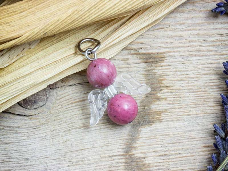 A valódi ásvány medál fém akasztó részét acélból / orvosi fémből készítettük, így tökéletesen antiallergén. Az angyalka szárnya akrillból készült. Az angyalka fejét, és testét valódi 8mm-es rodokrozit ásvány gyöngyök alkotják.