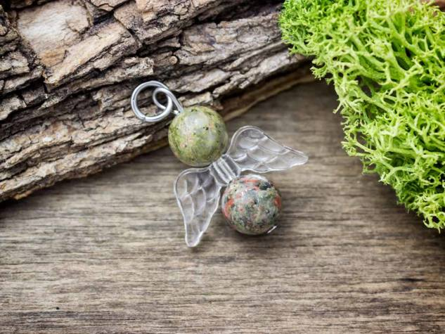 A valódi ásvány medál fém akasztó részét acélból / orvosi fémből készítettük, így tökéletesen antiallergén. Az angyalka szárnya akrillból készült. Az angyalka fejét, és testét valódi 8mm-es unakit más néven epidot ásvány gyöngyök alkotják.
