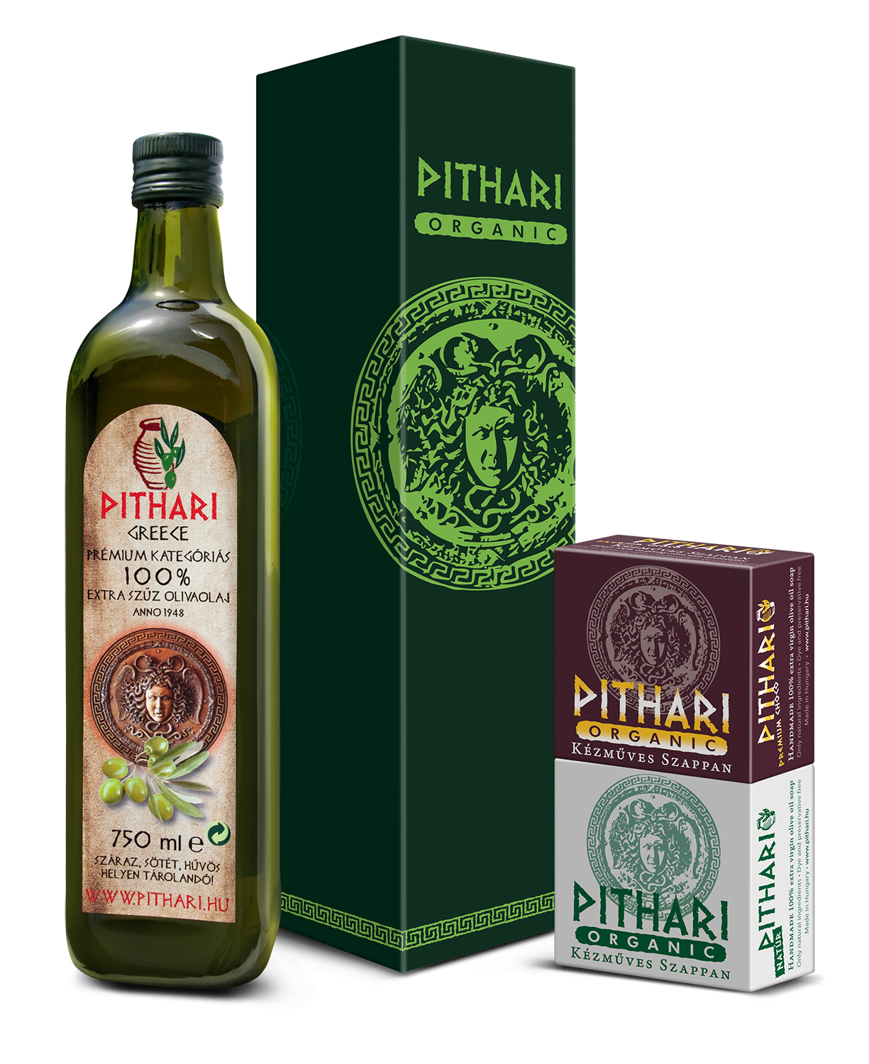 Pithari combo. A csomag tartalma 1 üveg 750ml-es Pithari 100% extra szűz olívaolaj + 2db kézműves szappan ( natúr + premium choco)