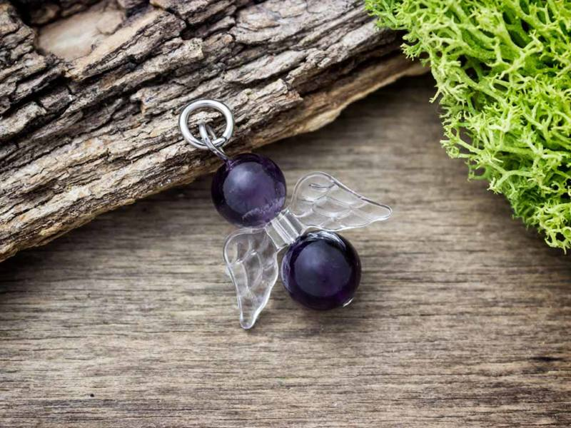 A valódi ásvány medál fém akasztó részét acélból / orvosi fémből készítettük, így tökéletesen antiallergén. Az angyalka szárnya akrillból készült. Az angyalka fejét, és testét valódi 8mm-es ametiszt ásvány gyöngyök alkotják.
