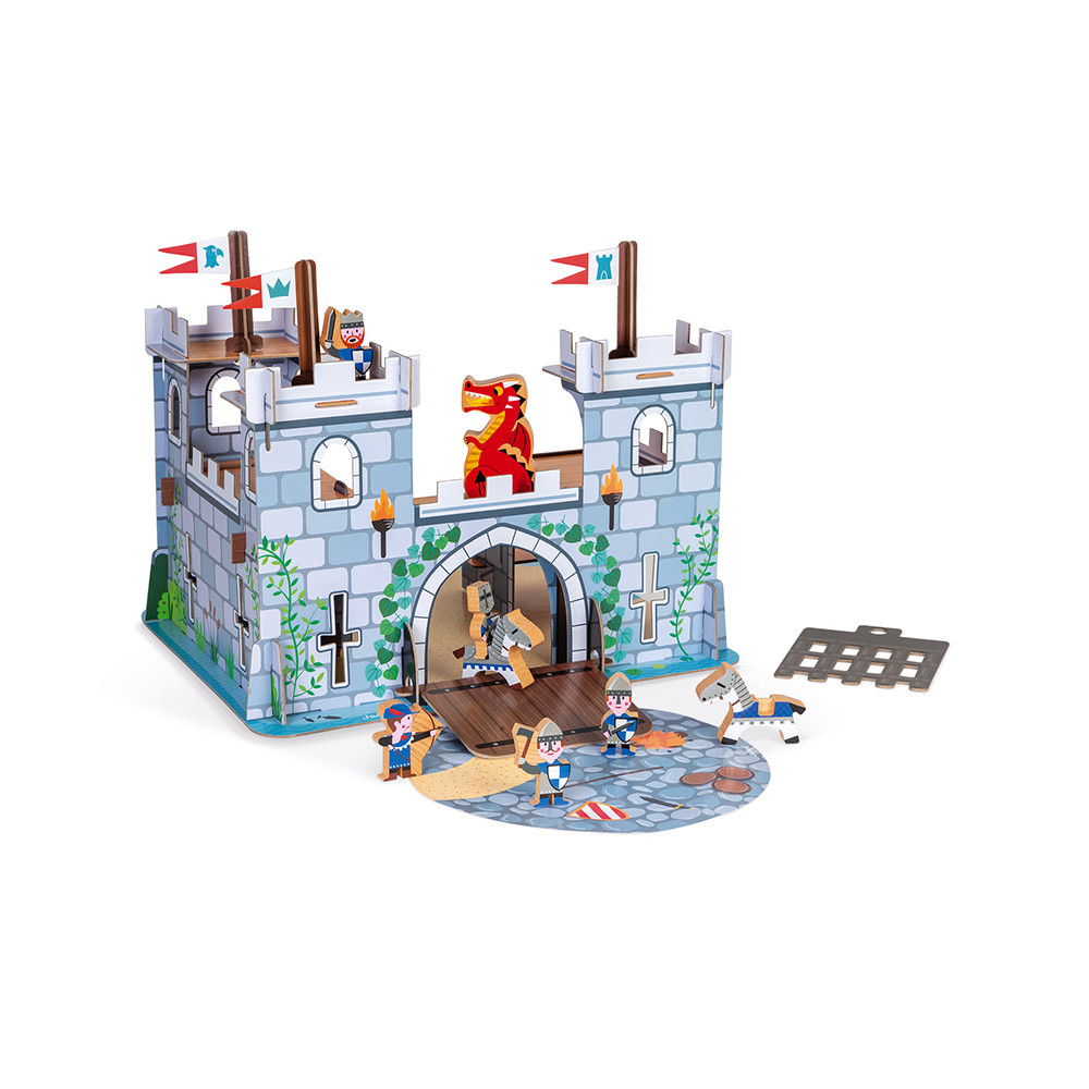 A lovagi kastély gyermeke lenyűgöző történeteket fog kitalálni ezzel az elkészítendő várral és számos kiegészítőjével. Felépítheti a kastélyt (merev kartonból) egy felnőtt segítségével, majd órákig játszhat! Ez a játék tartalmaz: egy nagy várat, 3 toronnyal, felvonóhíddal a kapujával, egy börtönt a sárkány bezárására, egy nagy lépcsőt az első emeletre való bejutáshoz a támadók taszítására és 8 fa figurát (5 lovag, 2 ló és egy sárkány). Jó játékot !