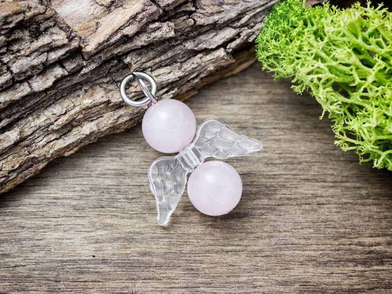 A valódi ásvány medál fém akasztó részét acélból / orvosi fémből készítettük, így tökéletesen antiallergén. Az angyalka szárnya akrillból készült. Az angyalka fejét, és testét valódi 8mm-es rózsakvarc ásvány gyöngyök alkotják.