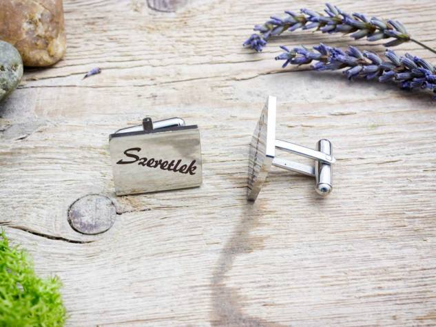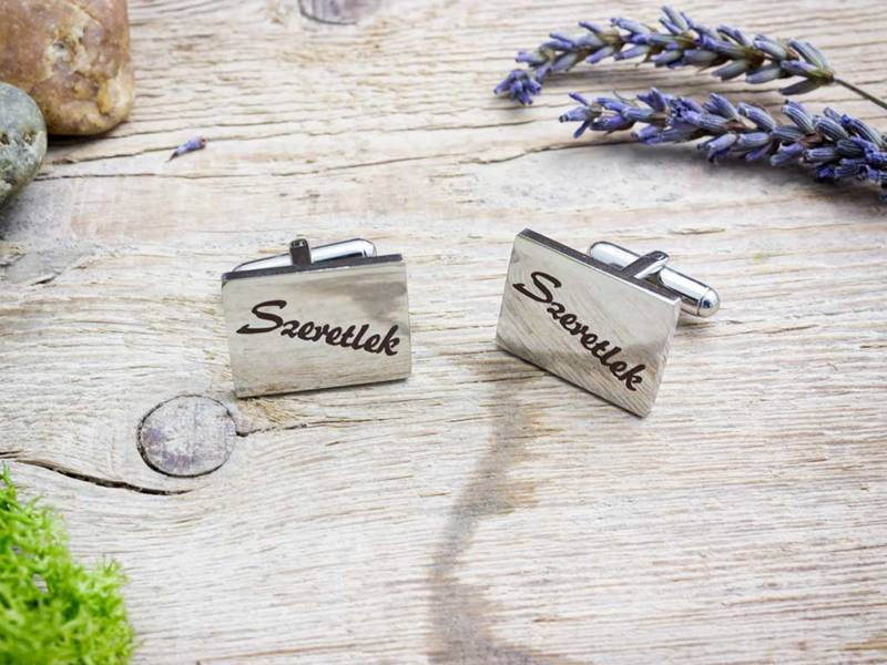 A mandzsettagomb alapanyaga időtálló acél, a felirat lézergravírozással készült rá.