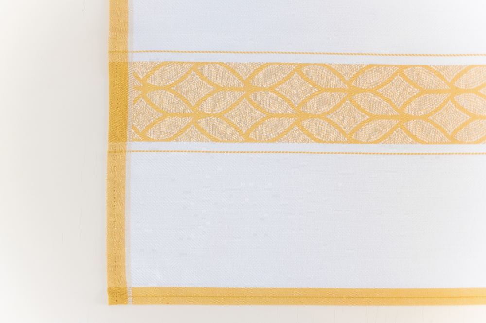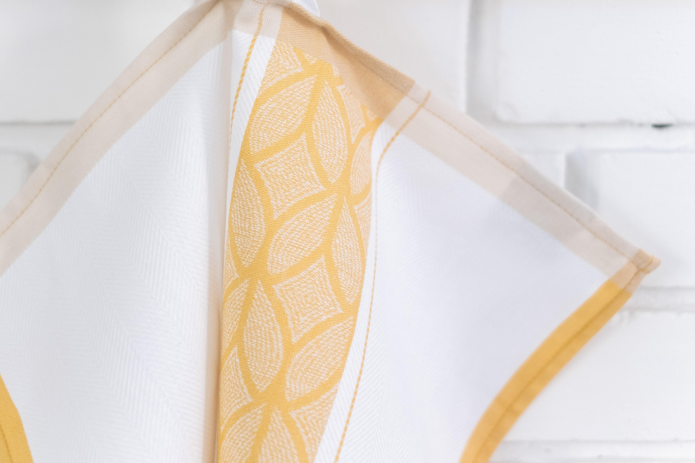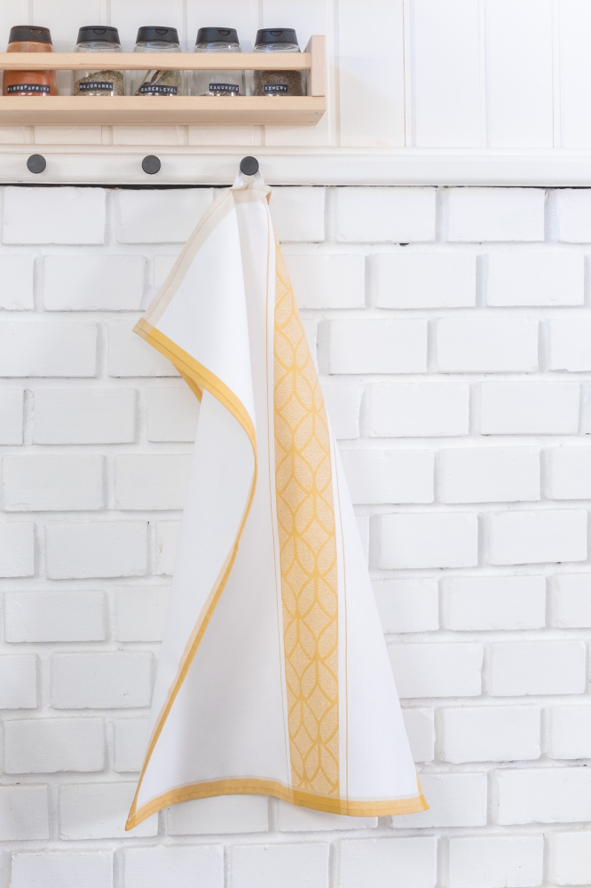 Színes konyharuha, fehér alapon okker mintával. Összetétel: 100% pamut. Méret: 50*70 cm.