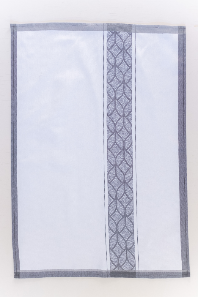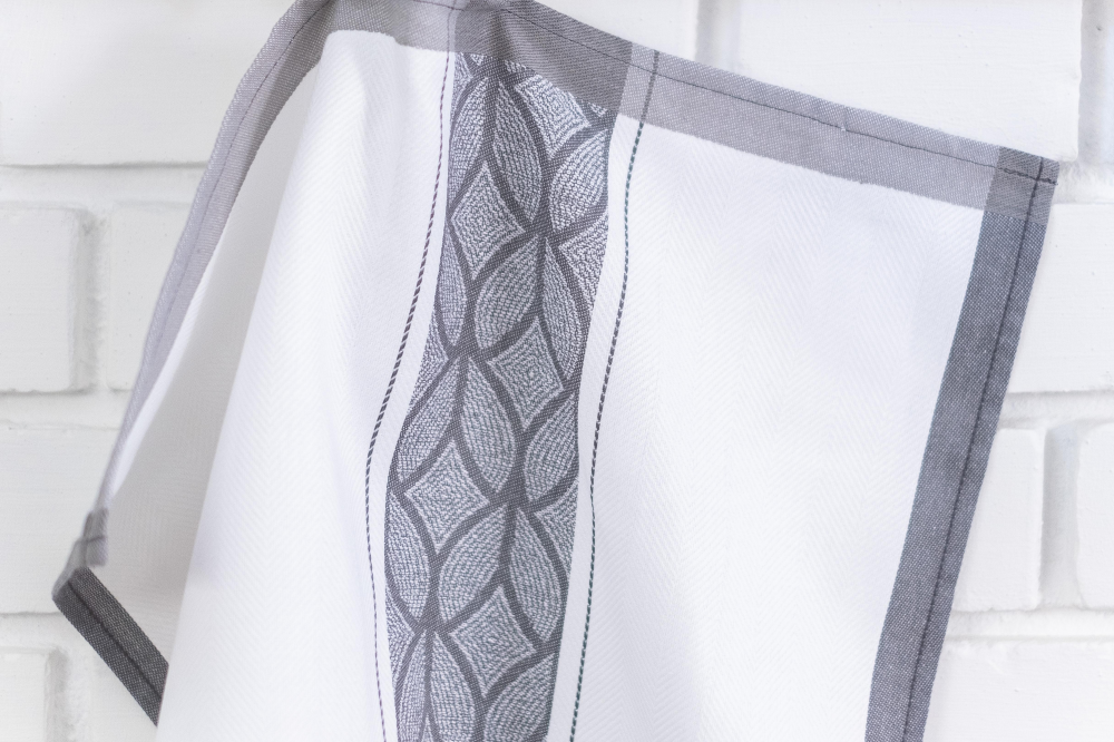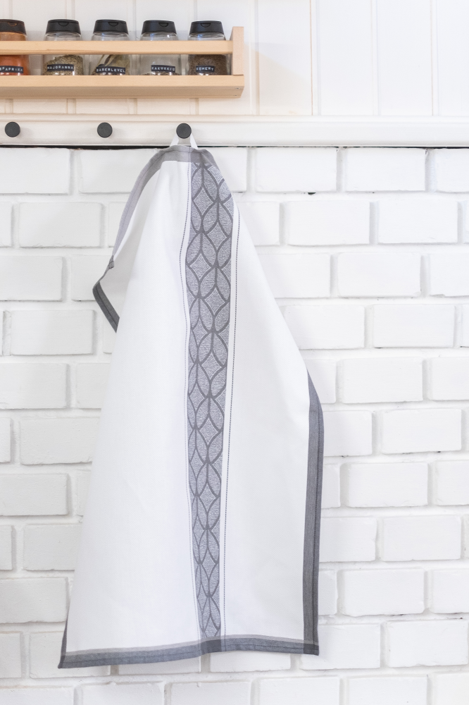 Színes konyharuha, fehér alapon szürke mintával. Összetétel: 100% pamut. Méret: 50*70 cm.