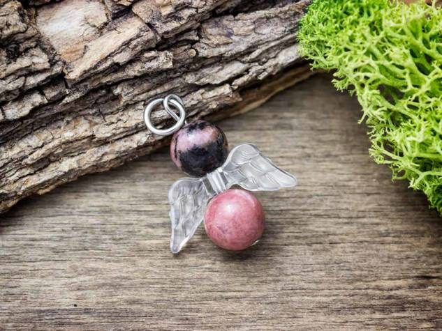 A valódi ásvány medál fém akasztó részét acélból / orvosi fémből készítettük, így tökéletesen antiallergén. Az angyalka szárnya akrillból készült. Az angyalka fejét, és testét valódi 8mm-es rodonit ásvány gyöngyök alkotják.