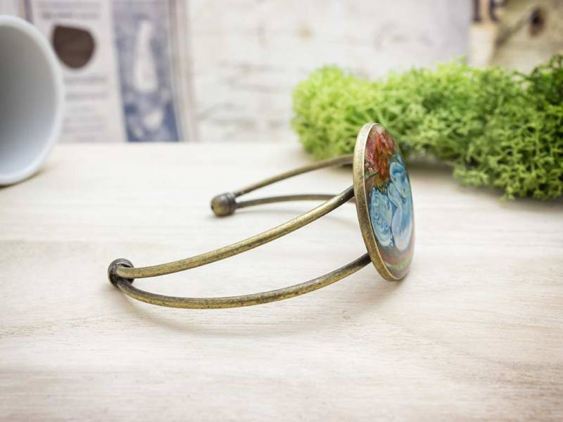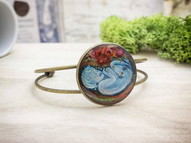 Műgyantás préselt virágos karperec. A szárított virágból adódóan esetenként eltérhet a virág mérete.