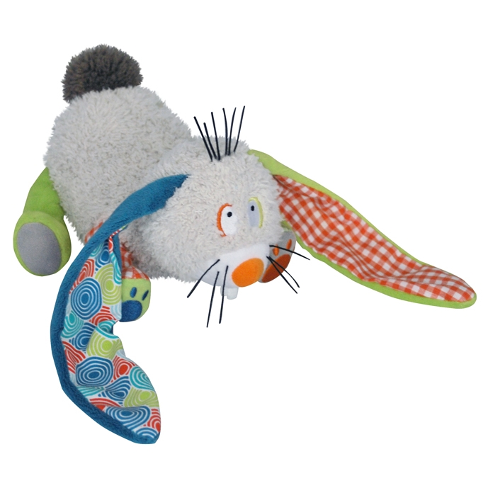 Gabin a nyuszi – A nyuszi alján lévő karika kihúzása után kellemes dallamot játszik, ameddig lassan visszahúzódok a plüssfigura belsejébe a zsinór.Alkalmas a kisgyermek figyelmének lekötésére, altatáshoz és a gyermek megnyugtatásához is kiváló segítség.Babakocsira és kiságyra is akasztható. De puha anyaga lehetővé teszi, hogy a baba mellé tegyük, kezébe adjuk.